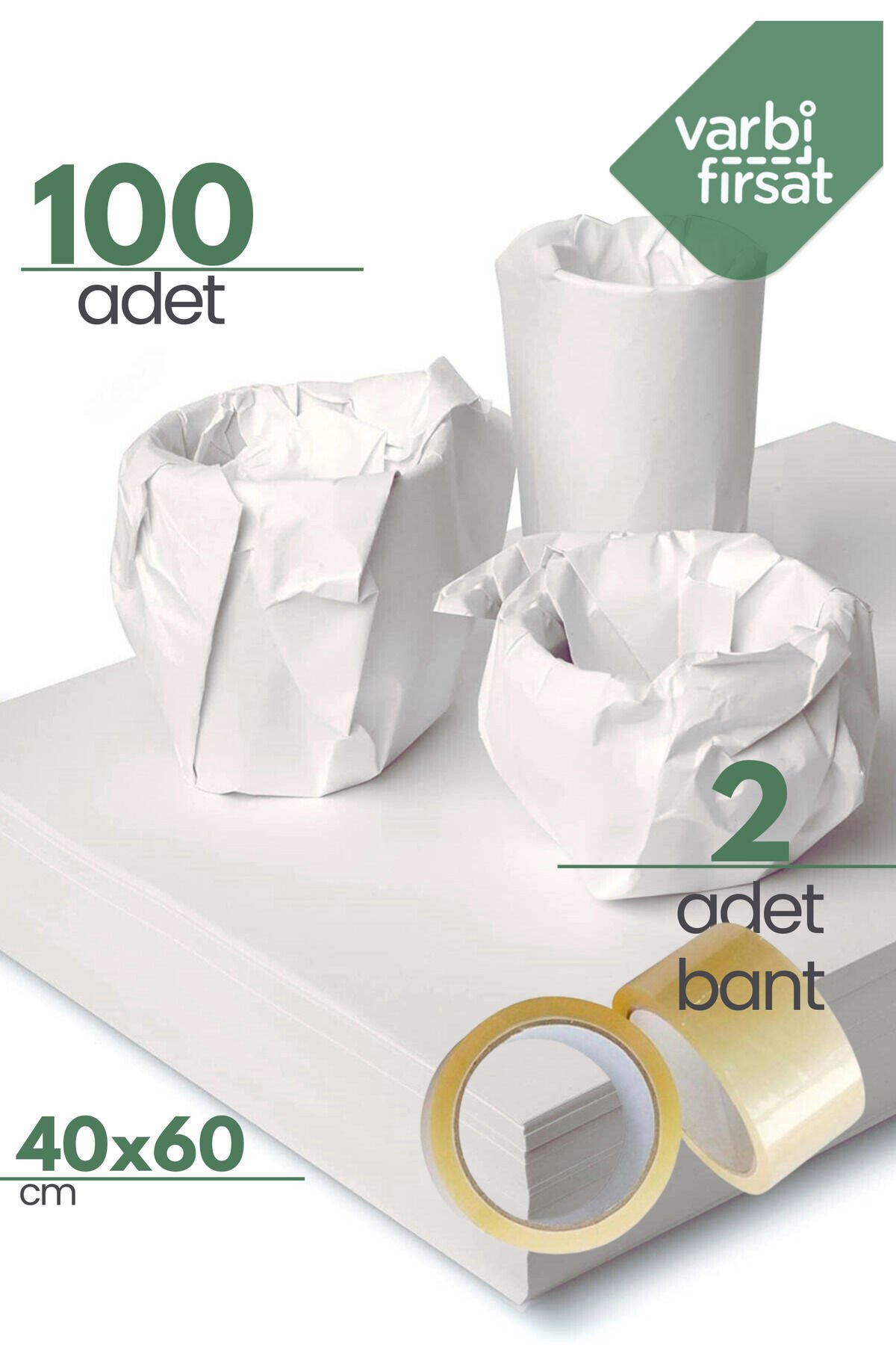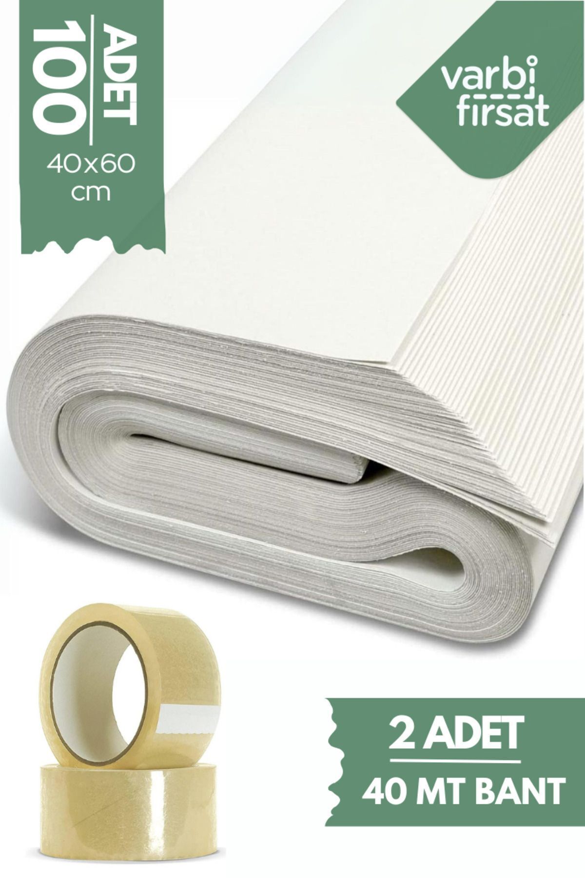 Gazete Kağıdı kalınlığında olup, naturel beyaz kağıttır Ürün hurda kağıt değildir.; Taşınma esnasında koli desteği için buruşturarak veya cam veya narin ürünlerinizi direkt sararak rahatlıkla kullanabilirsiniz.; Taşınırken tabak bardak vb eşyalarınızı çizilmeden ve kırılmadan korur.; Herhangi bir zararlı madde içermez Eşyalarınız zarar gelmeyecek şekilde paketlenir.; Ambalajlanması, stoklanması ve diğer tüm süreçleri, mutfakta ve evde kullandığınız ürünlerinizi hijyenik bir şekilde paketlemeye uygundur.; 40x60 Tabak - Bardak Sarma Taşıma Taşınma Paketleme Kağıdı 100 ADET kağıt ve 2 ADET 40 mt bant gönderilecektir.; Kimyevi ağartıcı içermez.; Her türlü hassas eşyanızın taşınmasında kullanabilirsiniz.; Ürün 3. Hamur kağıttır.; ; hediye paketi, taşınma kutu hazırlıklarında kullanılabilir.