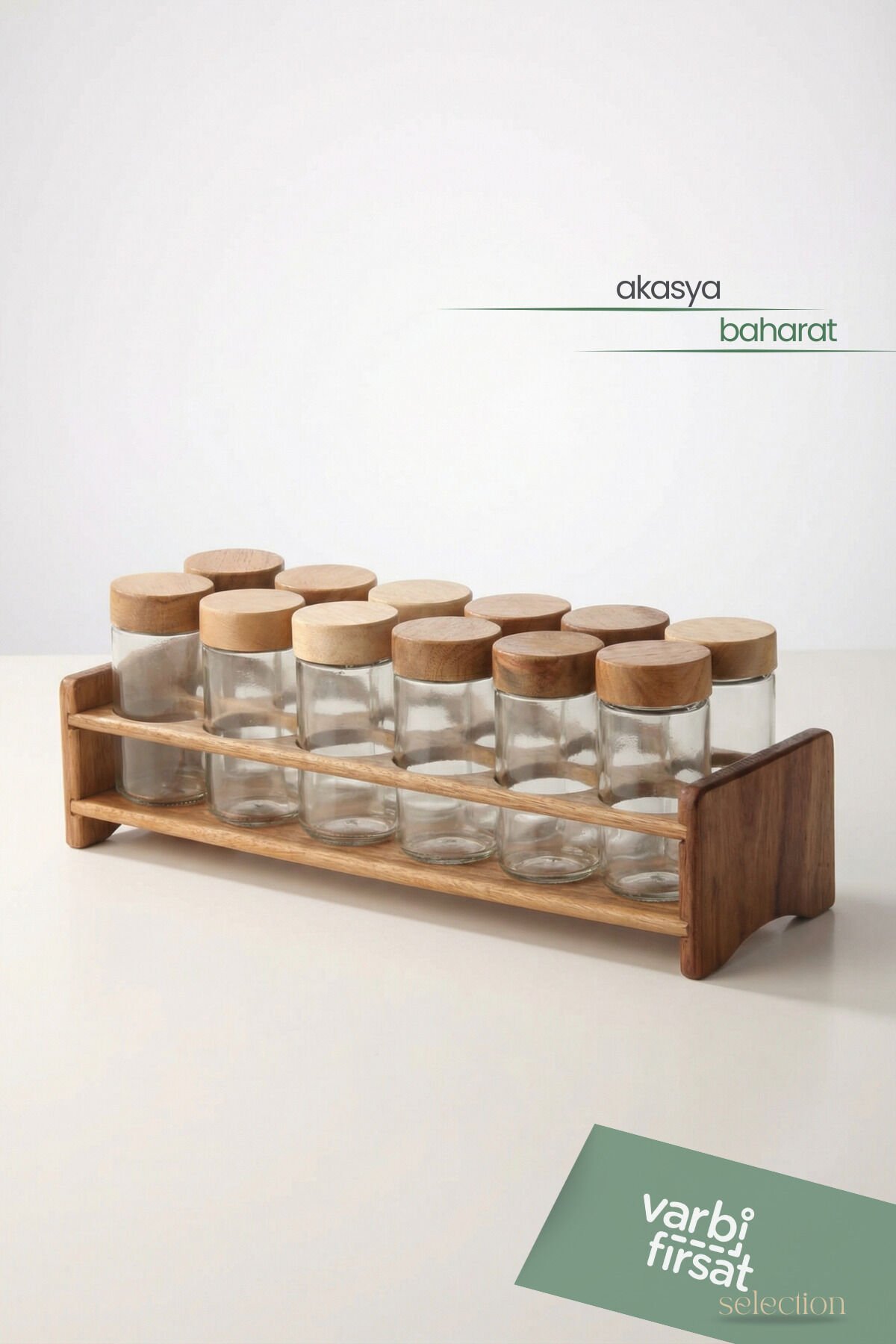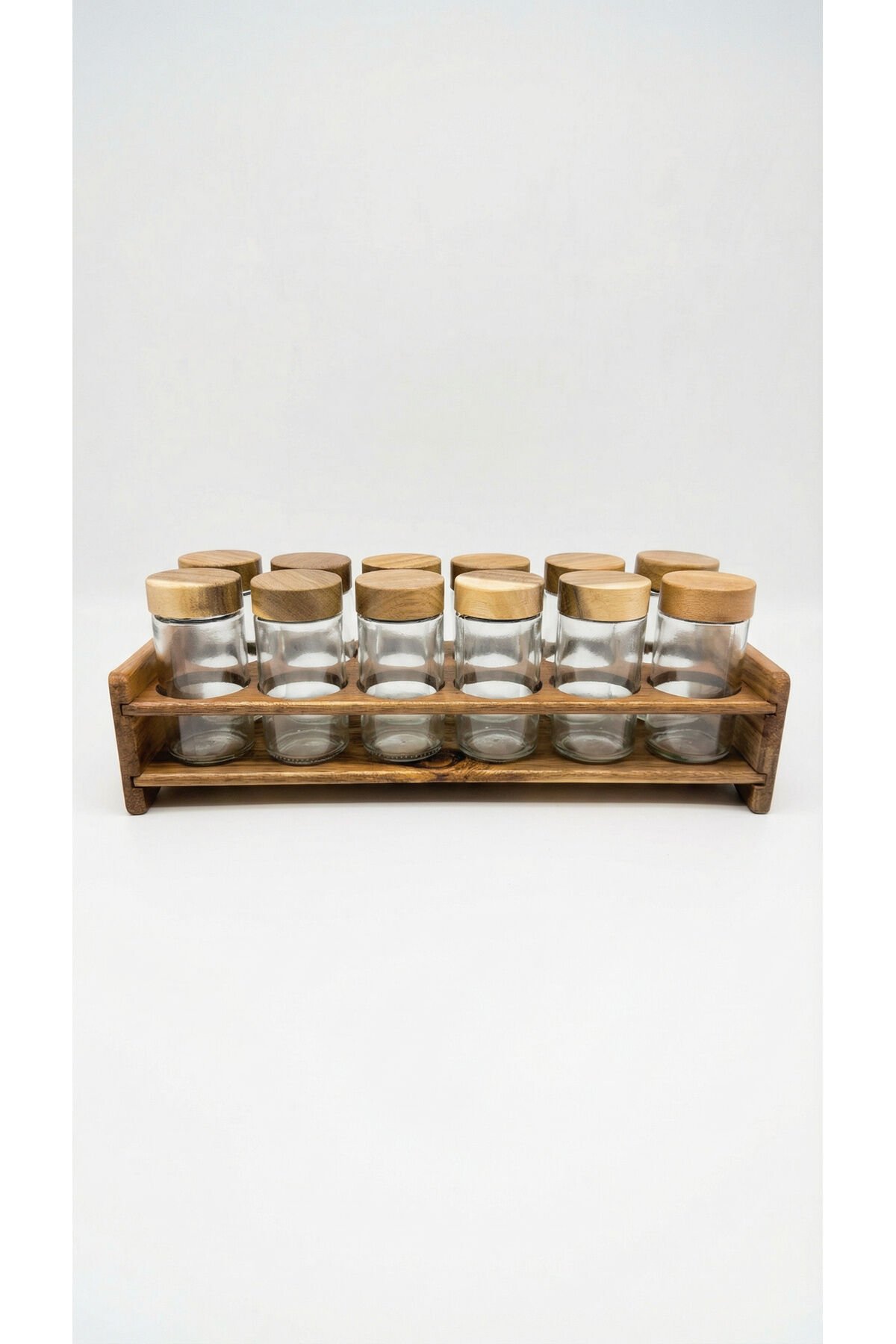 12’li Akasya Kapaklı Cam Baharatlık Set - Standı