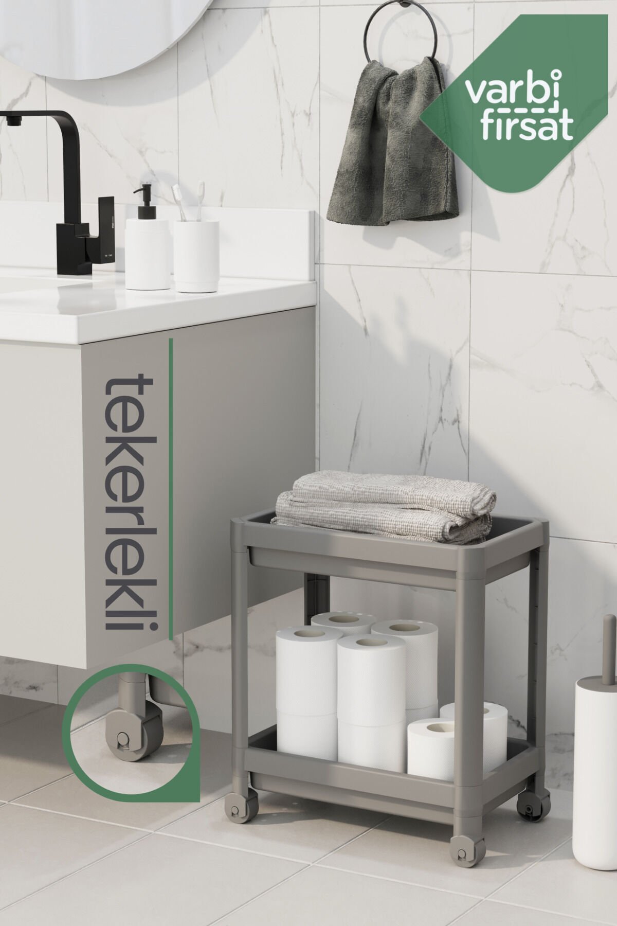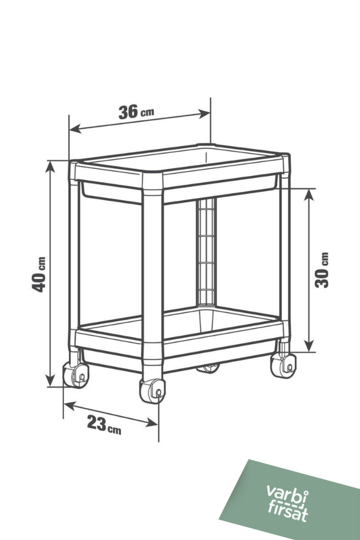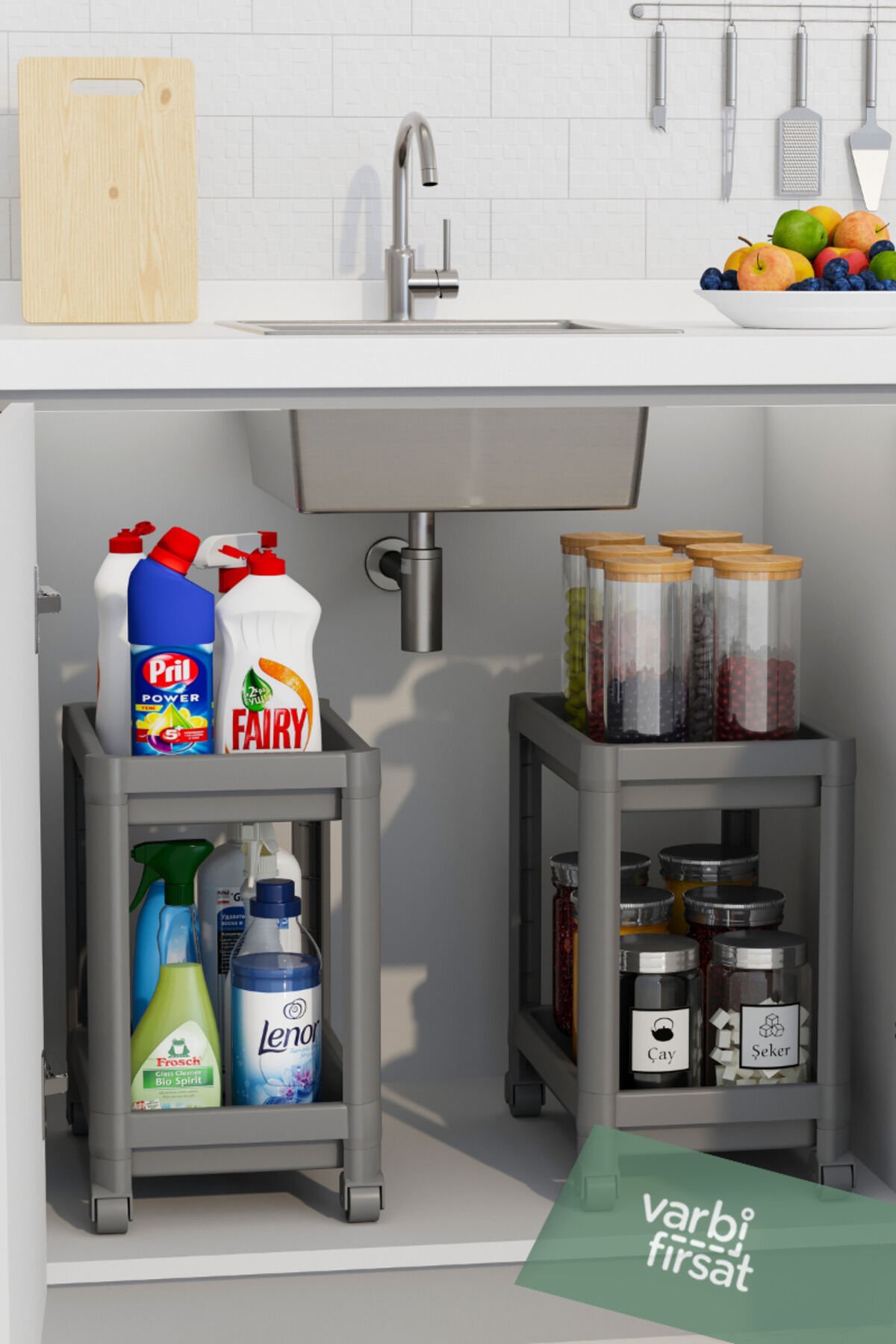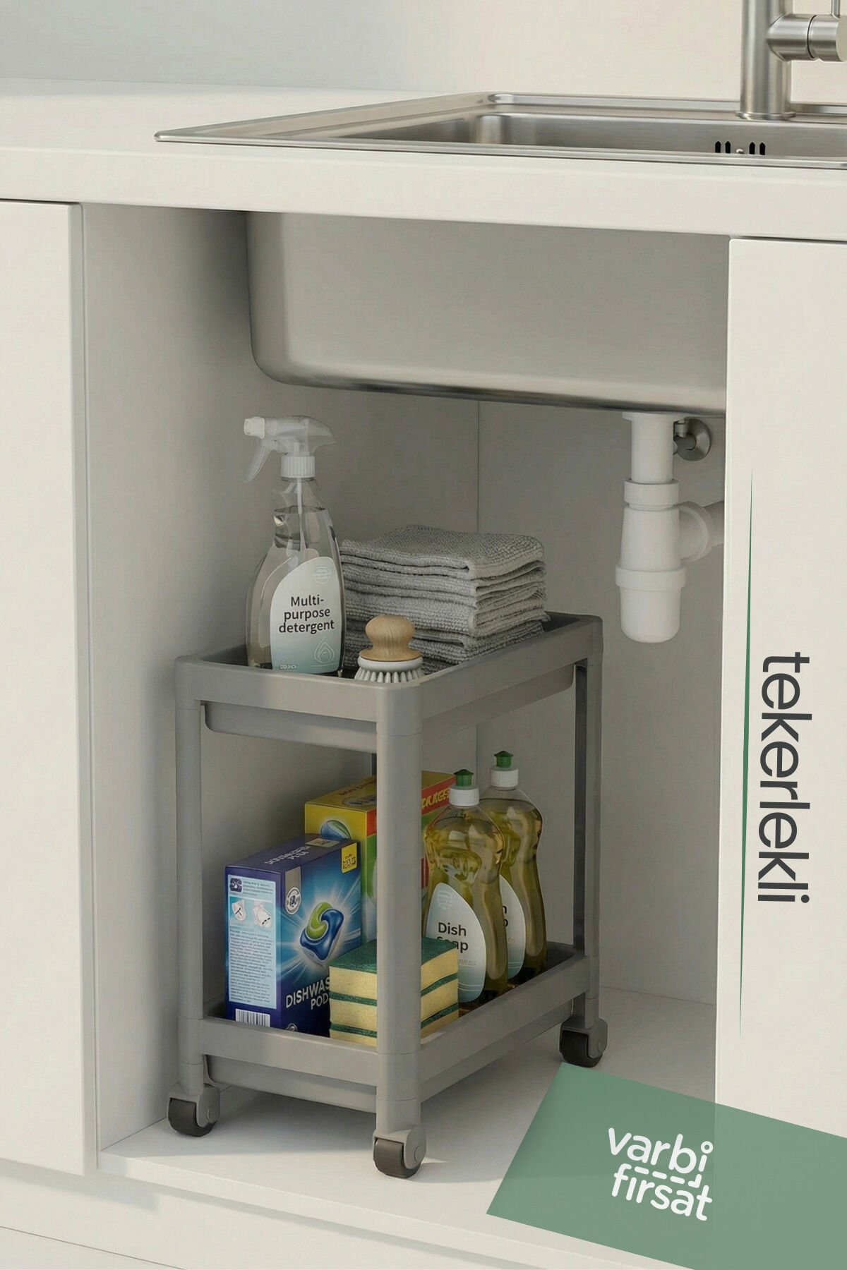 Varbifırsat 2 Katlı Tekerlekli Tezgah Altı Düzenleyici raf sistemi.; Tekerlekli ve tekerleksiz kullanım için özel tasarım.; ; Ürün Ölçüleri: Tekerlekli Kullanım : En: 22 cm Derinlik: 40 cm Yükseklik 41 cm Raf arası: 30 cm Ayaklı Kullanım : Yükseklik 38 cm Mutfak ve banyo alanlarınızı düzenlemek hiç bu kadar kolay olmamıştı.; ; Özellikler: • Çok Amaçlı Kullanım: Mutfak ve banyo temizlik detarjanları, bulaşık detarjanı, havlu, temizlik malzemeleri, şampuan gibi birçok ürünü rahatlıkla depolayabilirsiniz.; ; Dayanıklı plastik yapısı uzun ömürlü kullanım sağlar.; ; Kolay Kurulum: Demonte olarak gelen ürün, basit adımlarla hızlıca kurulabilir.; ; Şık Tasarım: Sade ve modern tasarımıyla mutfak ve banyo dekorasyonunuza uyum sağlar.; ; Bu düzenleyici ile mutfak tezgahınızın altını, banyo dolaplarınızı veya evinizin herhangi bir köşesini düzenleyebilir, alanınızı daha verimli kullanabilirsiniz.