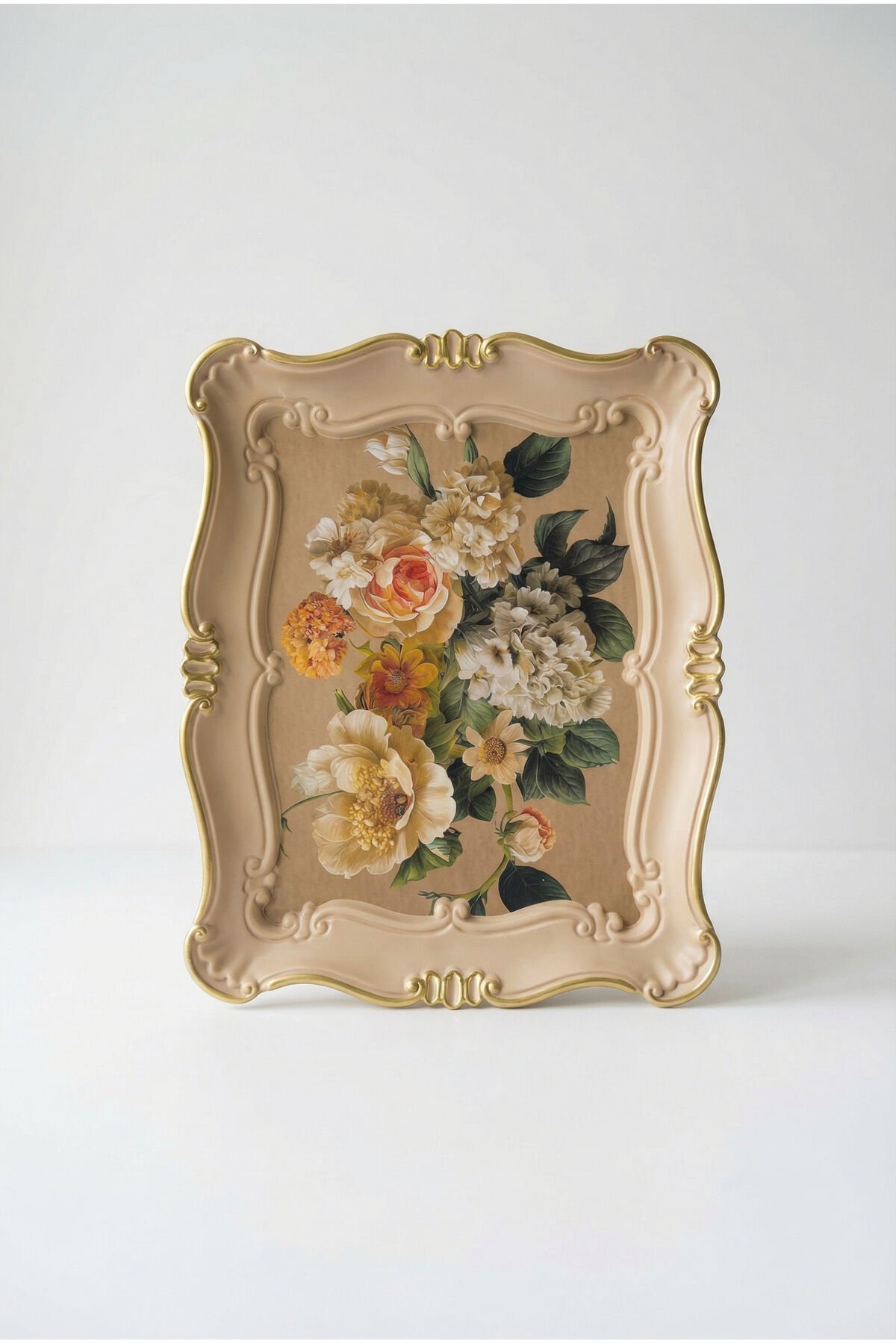 Şık ve zarif tasarımıyla dikkat çeken bu orta boy sunum tepsisi, estetik sunumlar yapmak isteyenler için ideal bir seçenektir.; 25x31x3 cm ölçüleri sayesinde kahve, çay, tatlı, atıştırmalık ve ikramlık sunumlarda pratik bir kullanım sağlar.; Kenarlarında yer alan gold detaylar ve romantik çiçek desenleri, tepsiye klasik ve zarif bir hava katar.; Hafif ve kullanışlı yapısı sayesinde kolay taşınır, dengeli tabanı ile servis sırasında güven verir.; Kolay temizlenebilen yüzeyi sayesinde uzun süreli ve hijyenik kullanım imkânı sunar.; Mutfakta servis amaçlı kullanılmasının yanı sıra, sehpa üstü dekoratif tepsi, takı veya aksesuar düzenleyici olarak da değerlendirilebilir.; Küçük alanlarda şıklık arayanlar için fonksiyonel ve dekoratif bir üründür.