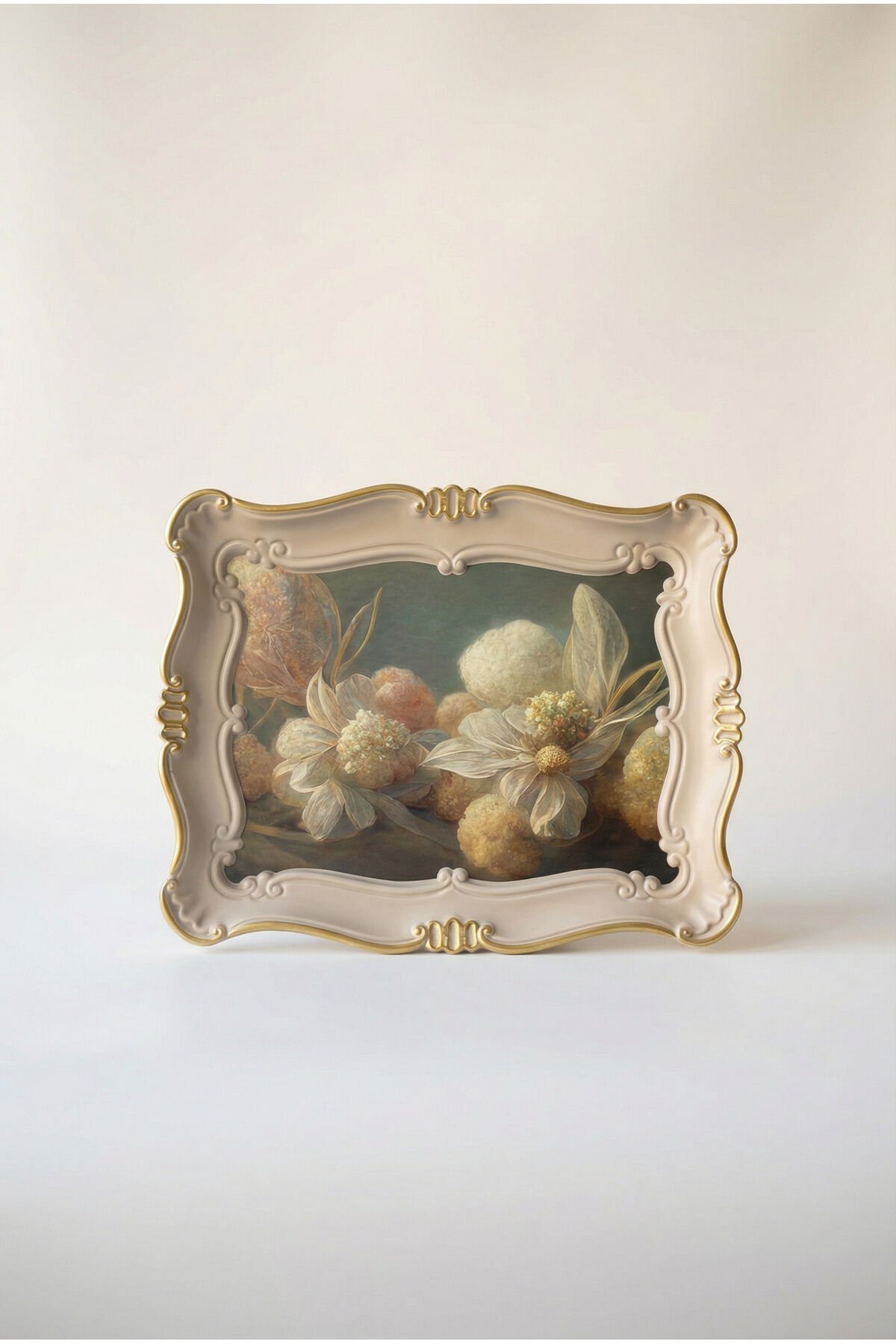 Zarif detayları ve klasik tasarımıyla öne çıkan bu büyük boy sunum tepsisi, sofralarınıza şıklık katmak için tasarlanmıştır.; 42x33x3 cm ölçüleri sayesinde çay, kahve, tatlı, pasta ve ikram sunumlarında geniş ve konforlu bir kullanım alanı sunar.; Kenarlarında yer alan gold renkli işlemeler, ürüne lüks ve estetik bir görünüm kazandırırken, vintage çiçek desenleri dekoratif bir dokunuş sağlar.; Sağlam yapısı ve dengeli tabanı ile servis sırasında güvenli kullanım sunar.; Pürüzsüz yüzeyi kolay temizlenir ve hijyenik kullanım sağlar.; Günlük kullanımın yanı sıra özel davetlerde, misafir ağırlarken veya sehpa üzerinde dekoratif amaçlı olarak da tercih edilebilir.