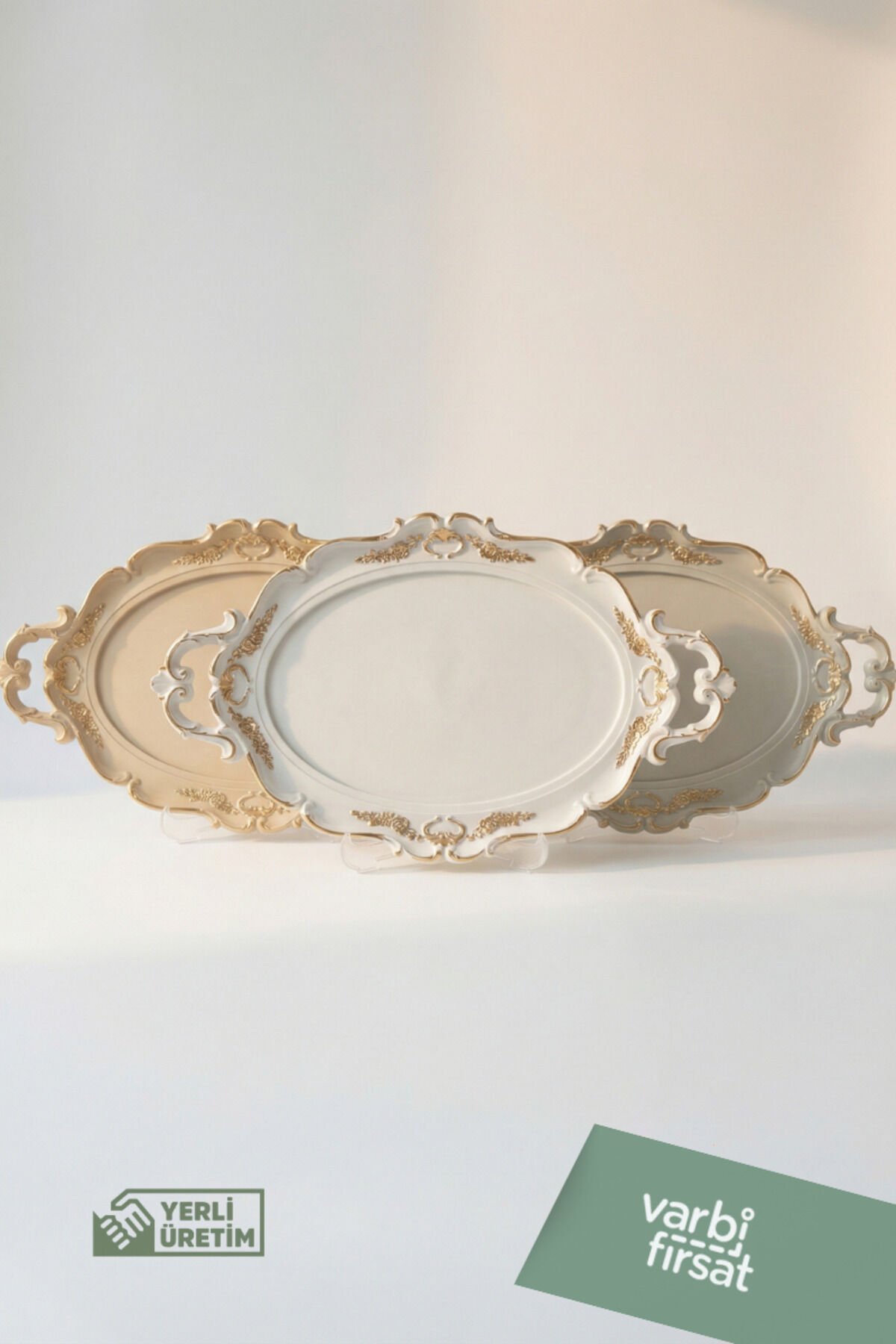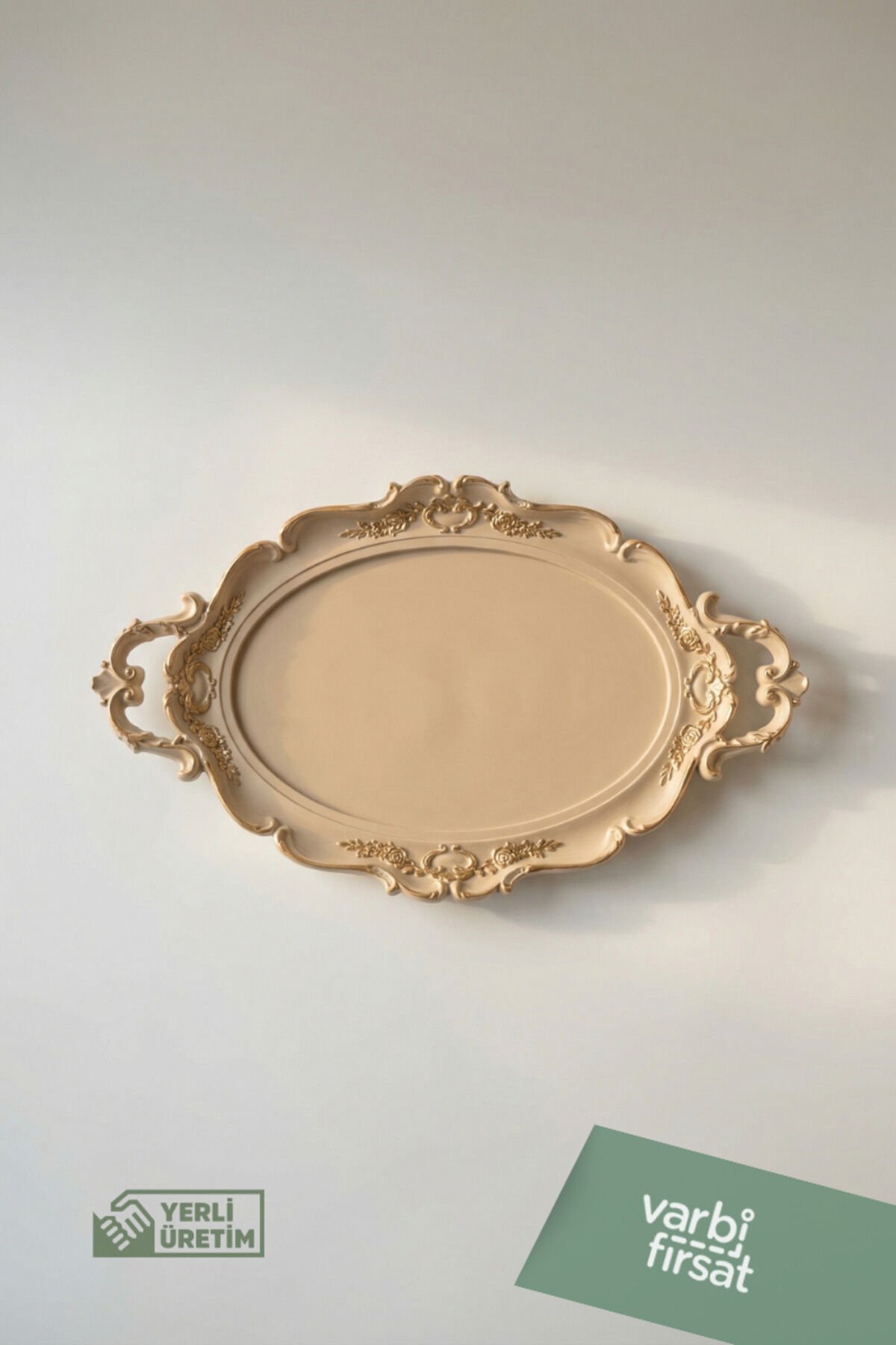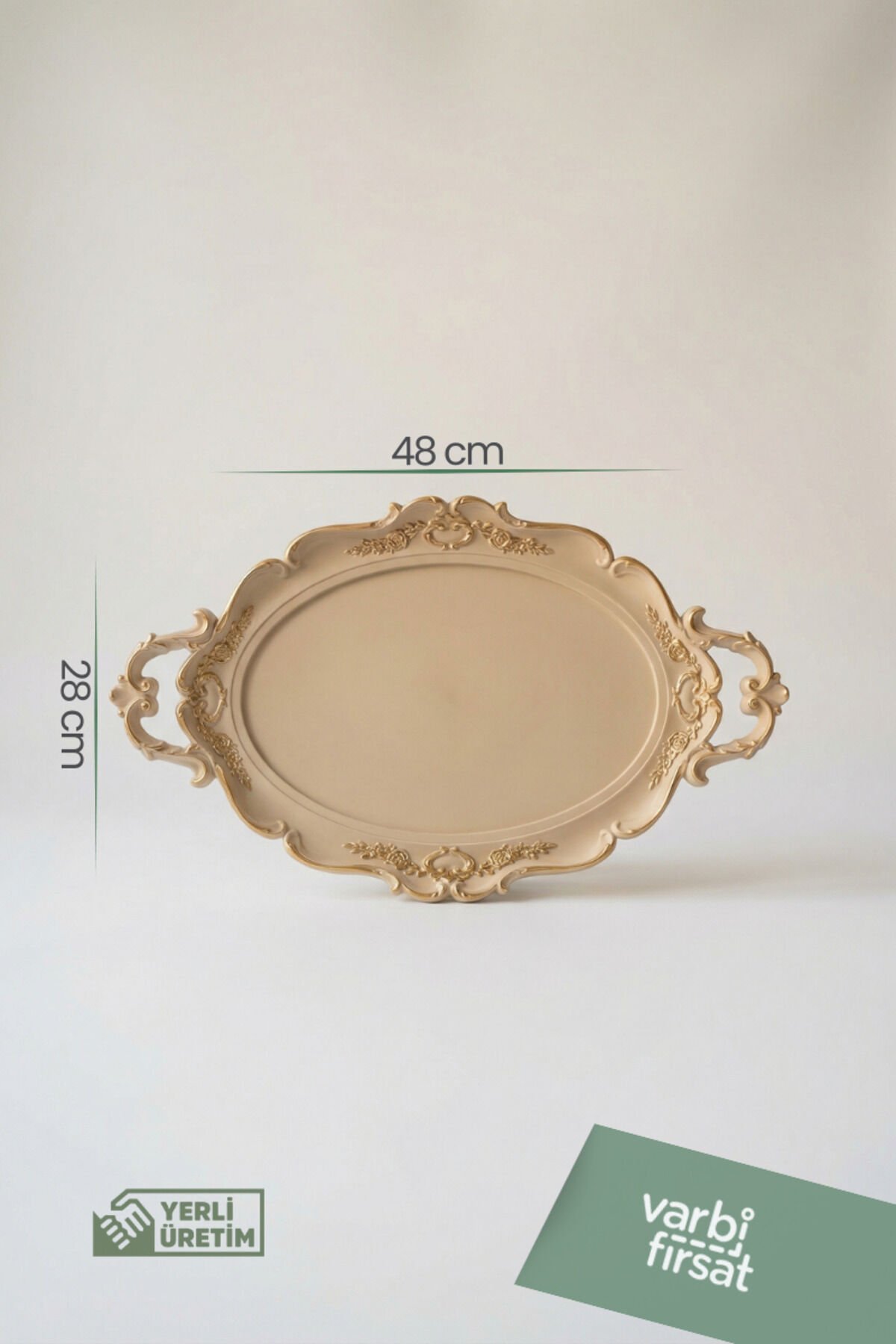 Oval Bej Gold Detaylı Sunum Tepsisi - 48x28x3 cm