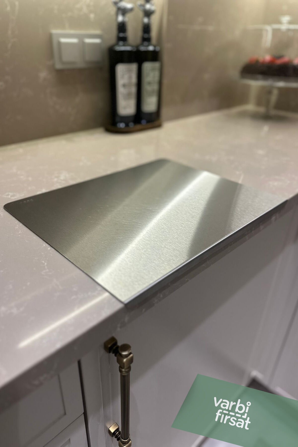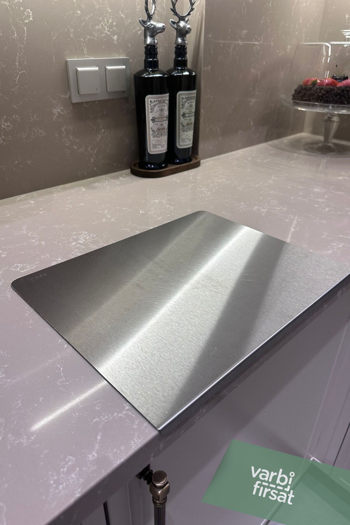 Paslanmaz Çelik Yüksek Kaliteli, Ergonomik Tasarımlı Kesme Tahtası.; Kenar çapakları el kesmeyecek şekilde alınmıştır Kaymaz ayakları sayesinde zeminle irtibatı minimize edilmiş ve kaldırması kolay hale getirilmiştir.; Malzeme paslanmaz çelik olduğu için diğer ahşap ve plastik kesme tahtaları gibi yüzeyinde kir ve leke barındırmaz.; bir üründür.; Son derece şık ve zarif bir tasarıma sahiptir.; Yemek hazırlamak için gönül rahatlığı ile kullanıp, makinede yıkayabilirsiniz.; Kolay yıkama ve temizlenmesi sayesinde uzun ömürlü kullanıma uygun yüksek kaliteye sahip bir üründür.;