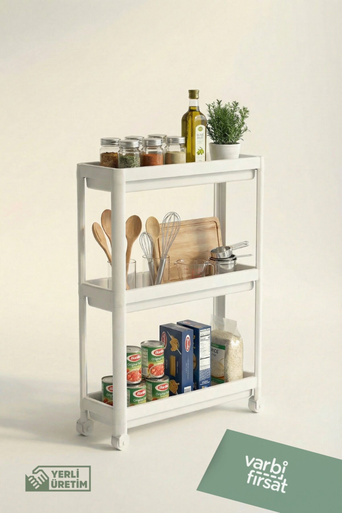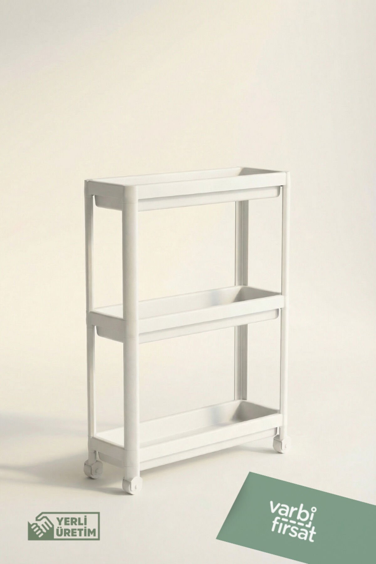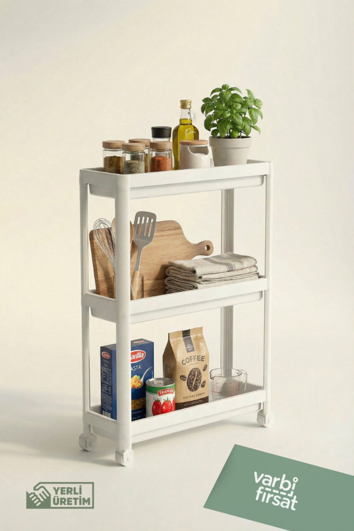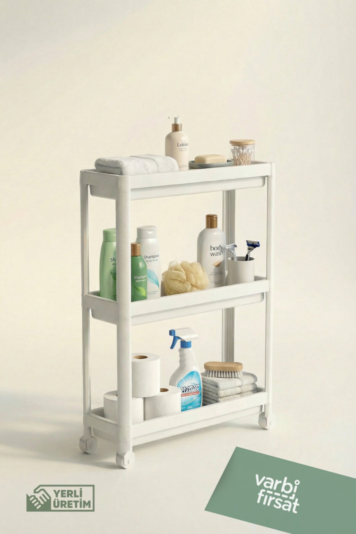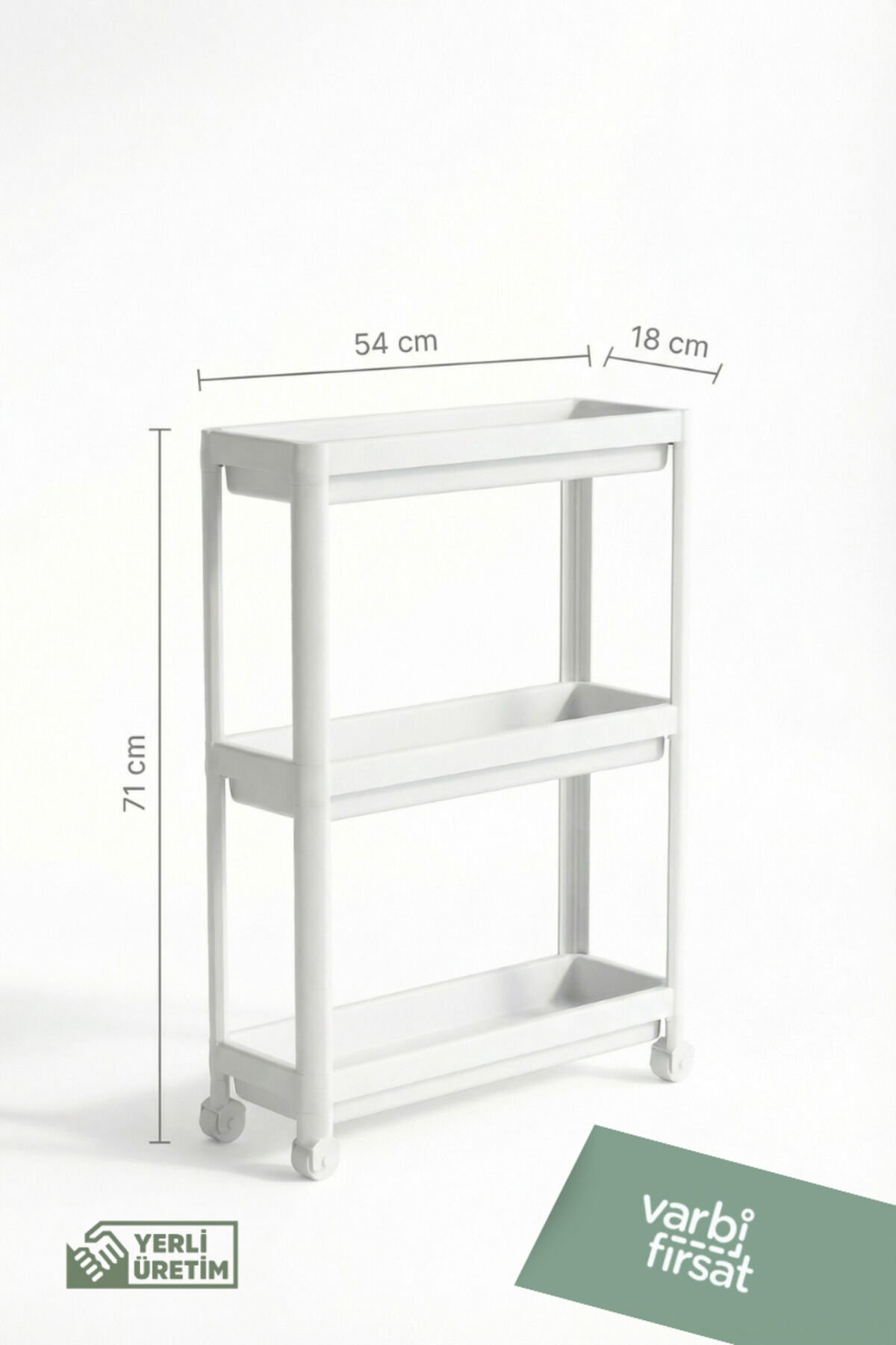 Slim 3 Katlı Tekerlekli Raf Ünitesi Beyaz Banyo Rafı Mutfak Rafı Servis Sehpası Organizer Ölçüler: Genişlik : 54 cm Derinlik : 18 cm Yükseklik : 71 cm Raflar Arası Mesafe : 30 cm Herhangi bir alet kullanmadan parçaları bir araya getirerek servis arabasını hızlı ve kolay bir şekilde monte edebilirsiniz. ; Sağlam yapısı ve dört tekerleği sayesinde mutfak arabasını taşıyabilir ve istediğiniz her yerde kullanabilirsiniz. ; Hatta küçük boyutları nedeniyle dar alanlarda da rahatça kullanılabilir. ; Rafın yüksek kenarları sayesinde şampuan ve saç kreminden banyo süngerine kadar herşey yerinde sabit kalabilir. ; Küçük banyolar için mükemmeldir. ; Malzeme Polipropilen plastik. ; En küçük banyolara sığar. ; Raflarda şampuan şişelerinden, sabun ve küçük eşyalara kadar tüm banyo malzemeleriniz için bol miktarda alan vardır.;